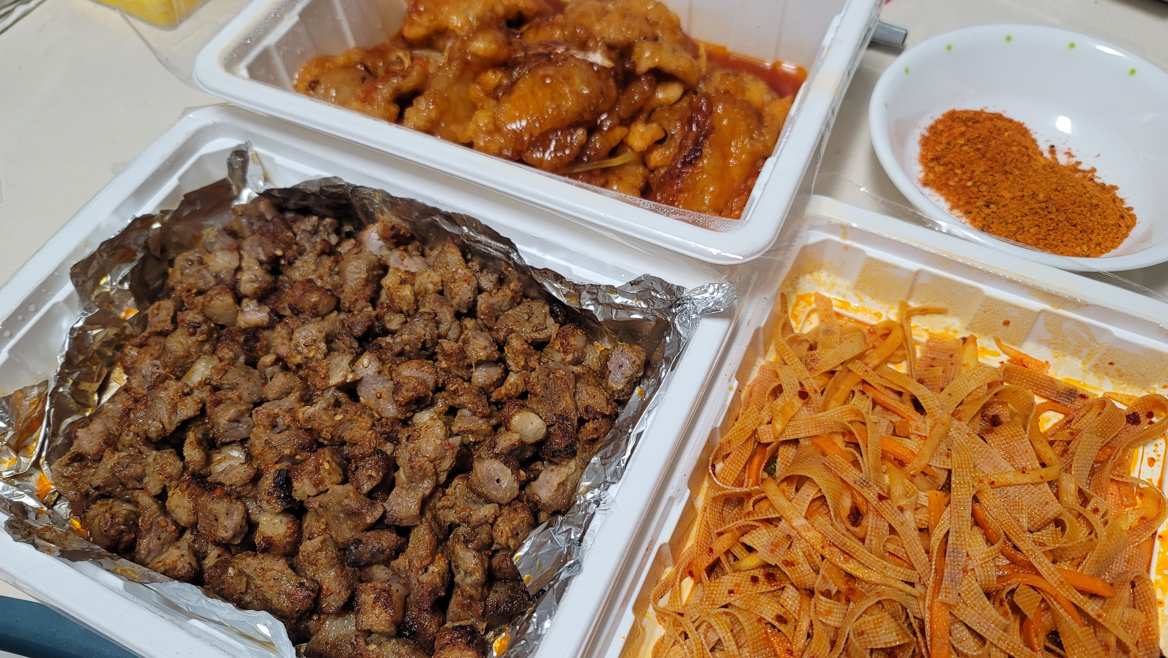양꼬치, 꿔바로우, 건두부무침. 저희는 이 세 가지와 함께 먹어봤습니다. 중국 술에 중국 음식은 완전 찰떡이지요 :)