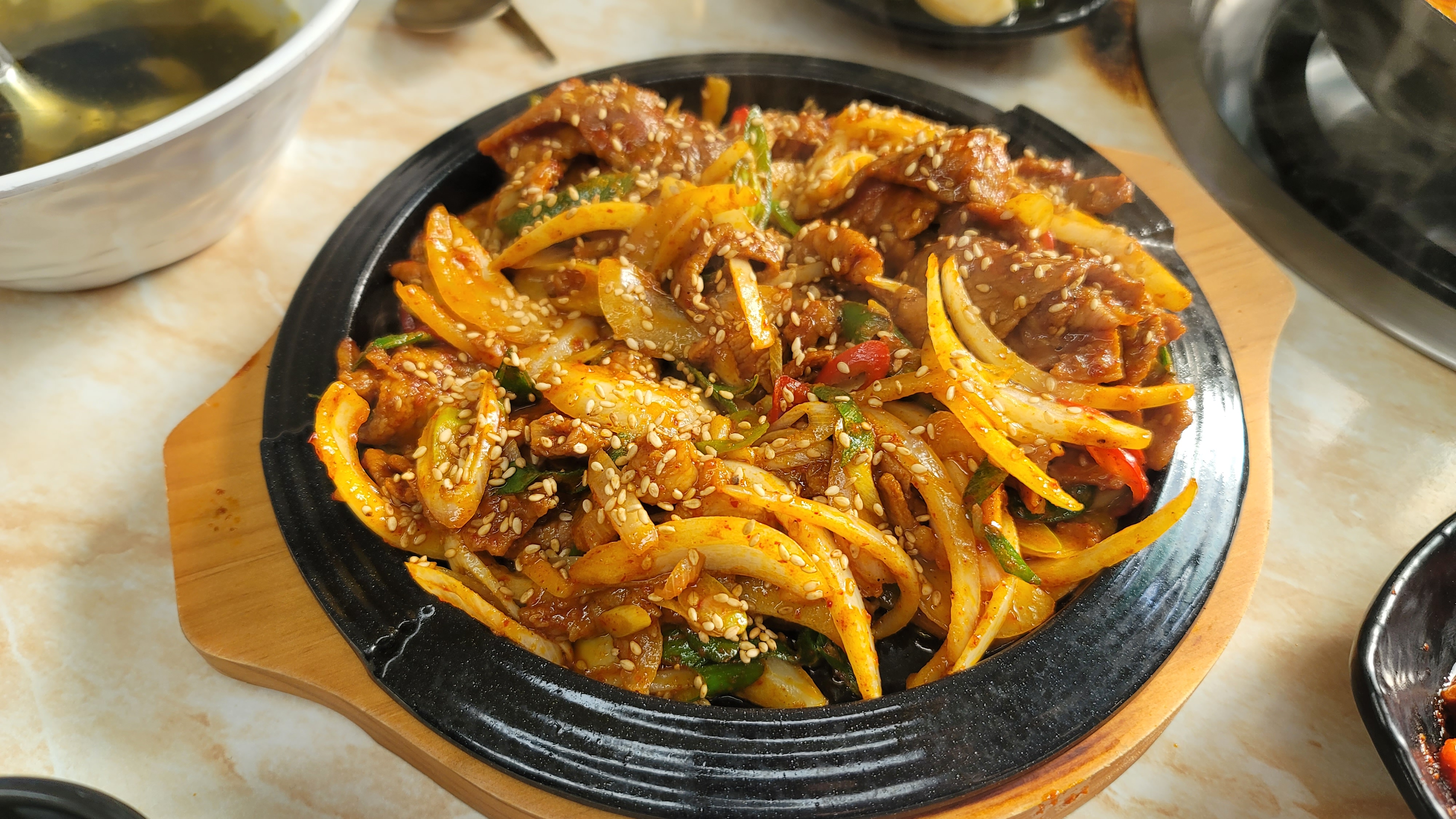 저는 김치찌개를 매일 먹을 수 있을만큼 좋아하는데요. 용인 재벌집 김치찌개는 '생고기 김치찌개'라는 점을 너무 잘 알려주듯 고기가 정말 허여멀건하고 냄새가..ㅠㅠ 나는 생고기였고요. 국물이 너무 김칫국에 가까워서 한참 끓이고 밥을 절반 정도 먹은 후에 그나마 먹을만해 졌습니다. 제가 어지간하면 고기 냄새난다고 잘 안하는데, 옆 친구가 제 얘기 듣고 씹어보지도 않고 냄새만 맡아도 돼지냄새가 난다고..ㅋㅋㅋ 제육볶음은 자극적이지 않아서 좋았구요, 고추장 없이 고추가루로만 볶은 슴슴한 제육볶음이었어요.