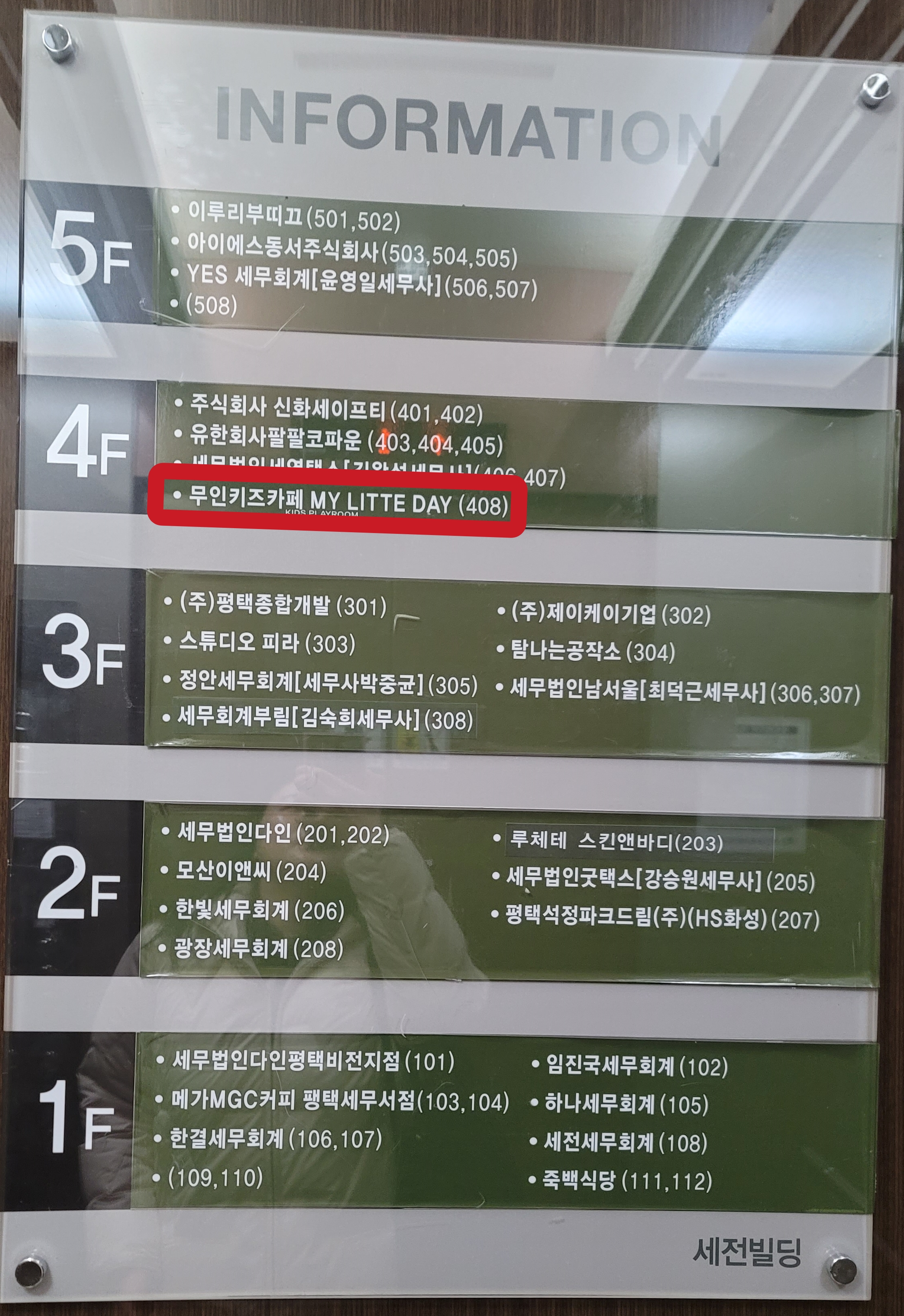 평택 무인 키즈카페 마이리틀데이는 평택세무서 맞은편 건물, 죽백동에서 유명한 백반집인 '죽백식당' 건물 4층에 위치합니다. 입간판 같은 게 없어서 이게 맞나? 싶을 수도 있지만.. 죽백식당의 맛있는 밥 냄새가 풍기는 곳 옆에 있는 엘리베이터를 타고 4층으로 가시면 됩니다 :)